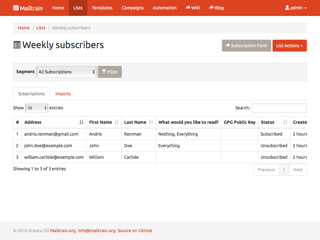 ISTC Mailing System allows you to easily manage even very large lists. Million subscribers? Not a problem. You can add subscribers manually, through the API or import from a CSV file. All lists come with support for custom fields and merge tags as well.